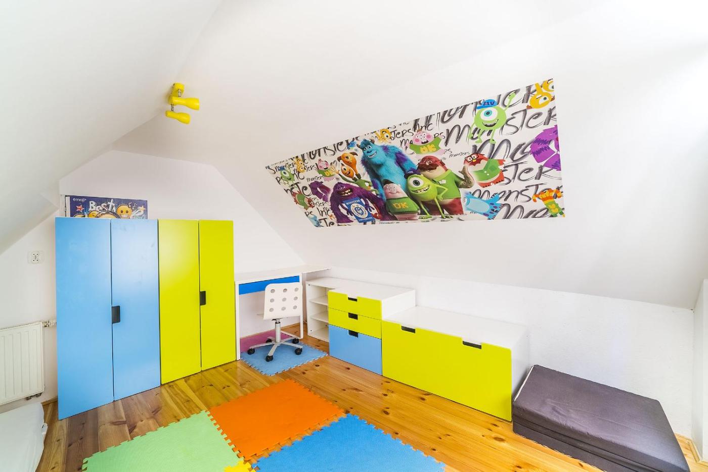 Domek. This chalet consists of 3 bedrooms, a kitchen and 1 bathroom with a walk-in shower and a hairdryer. Guests can make meals in the kitchen that is equipped with a stovetop, a refrigerator, a dishwasher and kitchenware. The chalet provides a washing machine, a dining area, a wardrobe, a flat-screen TV, as well as garden views. The unit offers 4 beds. Domek - 4 osobowy. Powierzchnia pokoju ok.: 46 mkw.